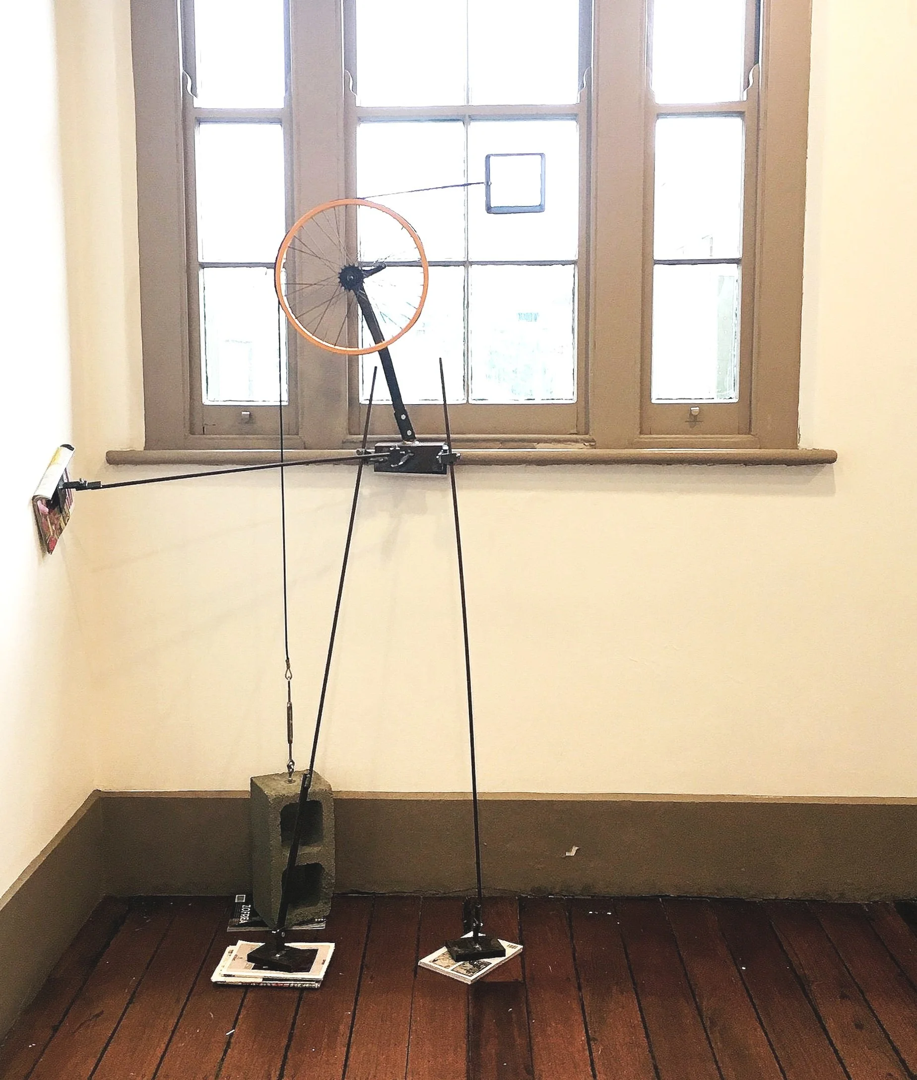Wackadoo, 2022, Steel, bike wheels, bike tubes, drill, timber and tie-down strap. NFS