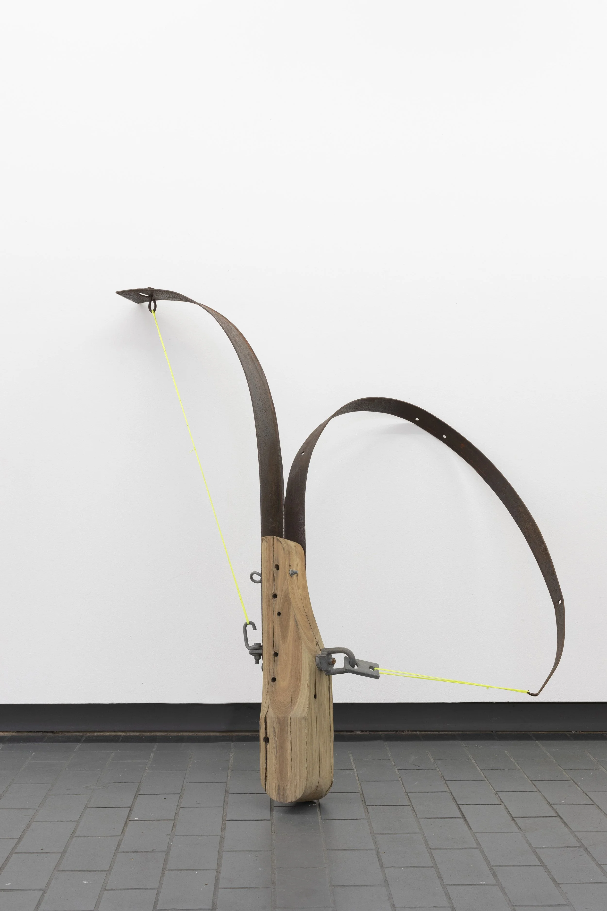 Sprung, 2024. Steel, hardwood, telegraph pole bracket and builders string, 135 x 145 x 75 cm. P.O.R.