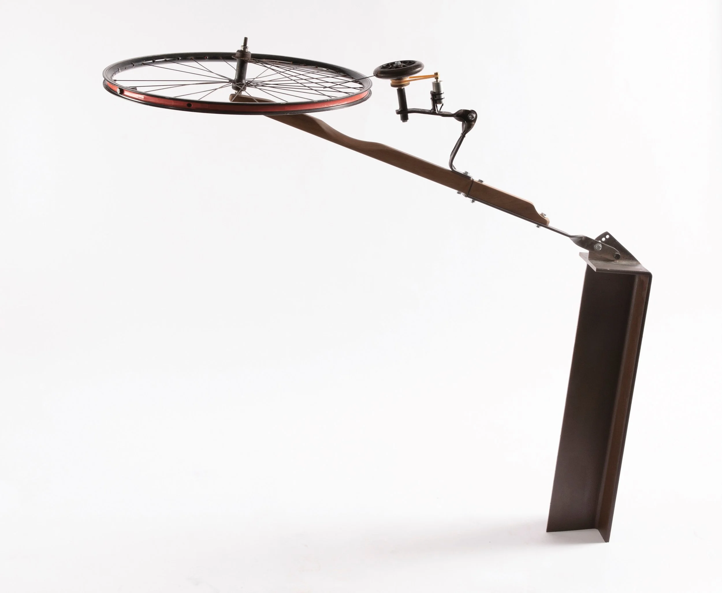 Feather gesture, 2022, Steel, bike wheel and tube, wire, feather, sinker, hardwood, dc motor, 94 cm x dimensions variable. NFS