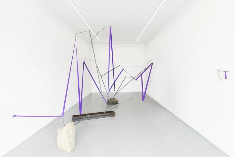 Purple Sky Trains, 2025. Sandstone, granite, mild steel, stainless steel pins and polypropylene webbing. Instillation Approx. 3.2 x 3.9 x 4.2 Metres. Price: NFS (Draw SPACE)