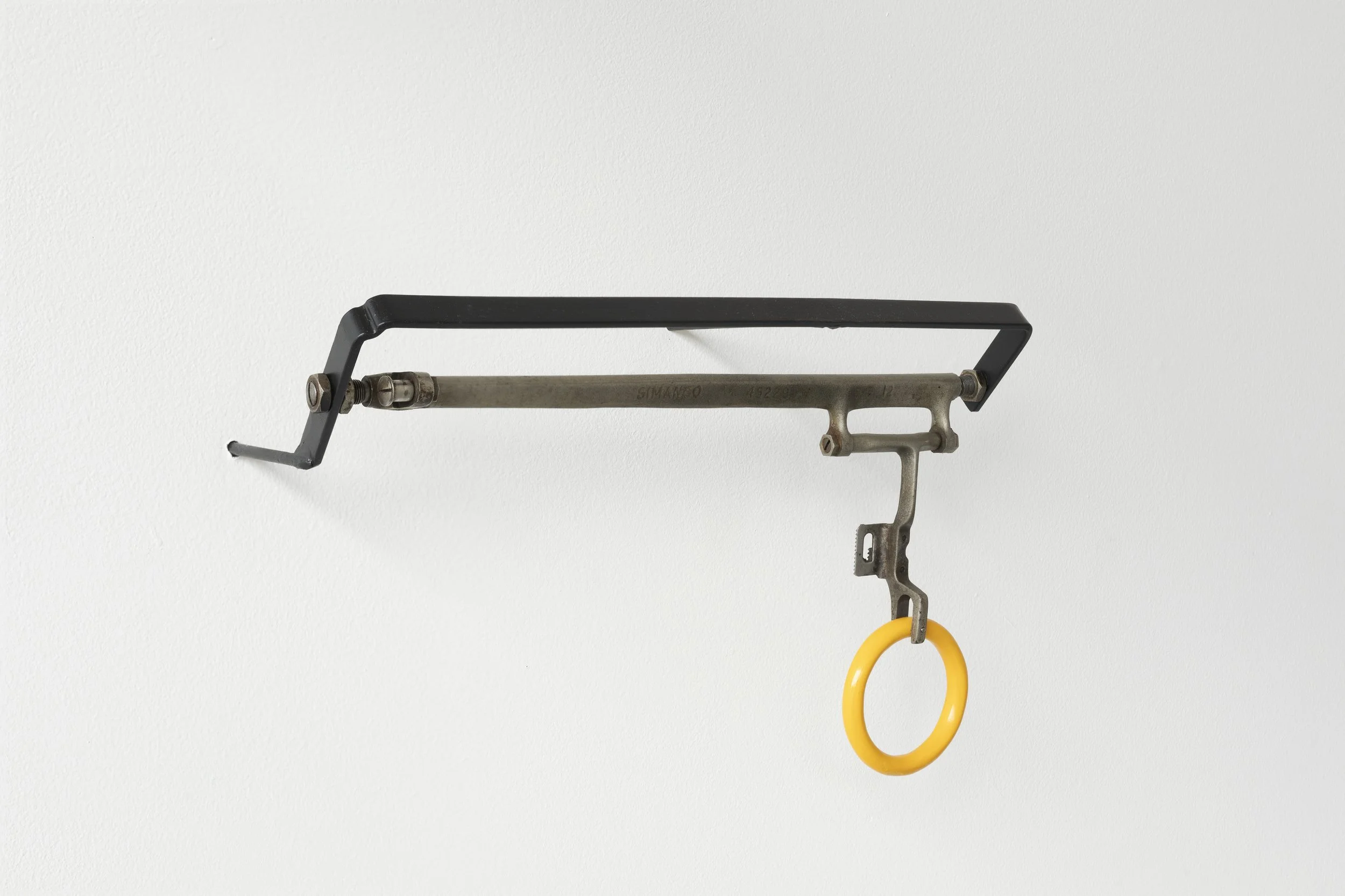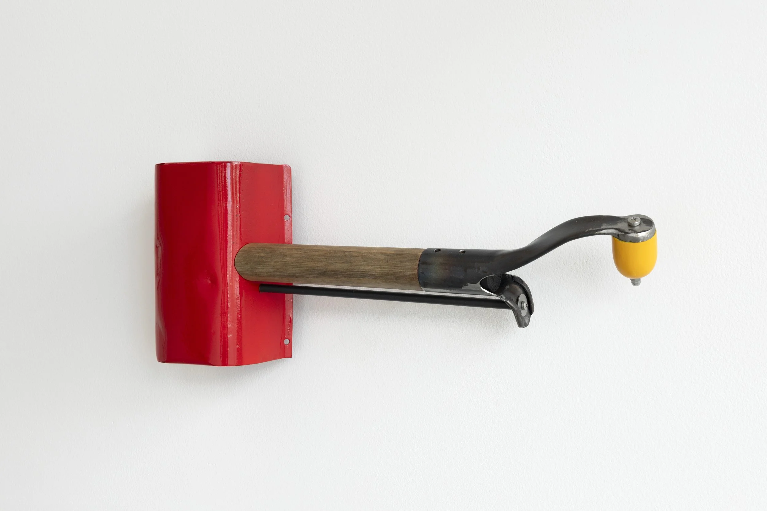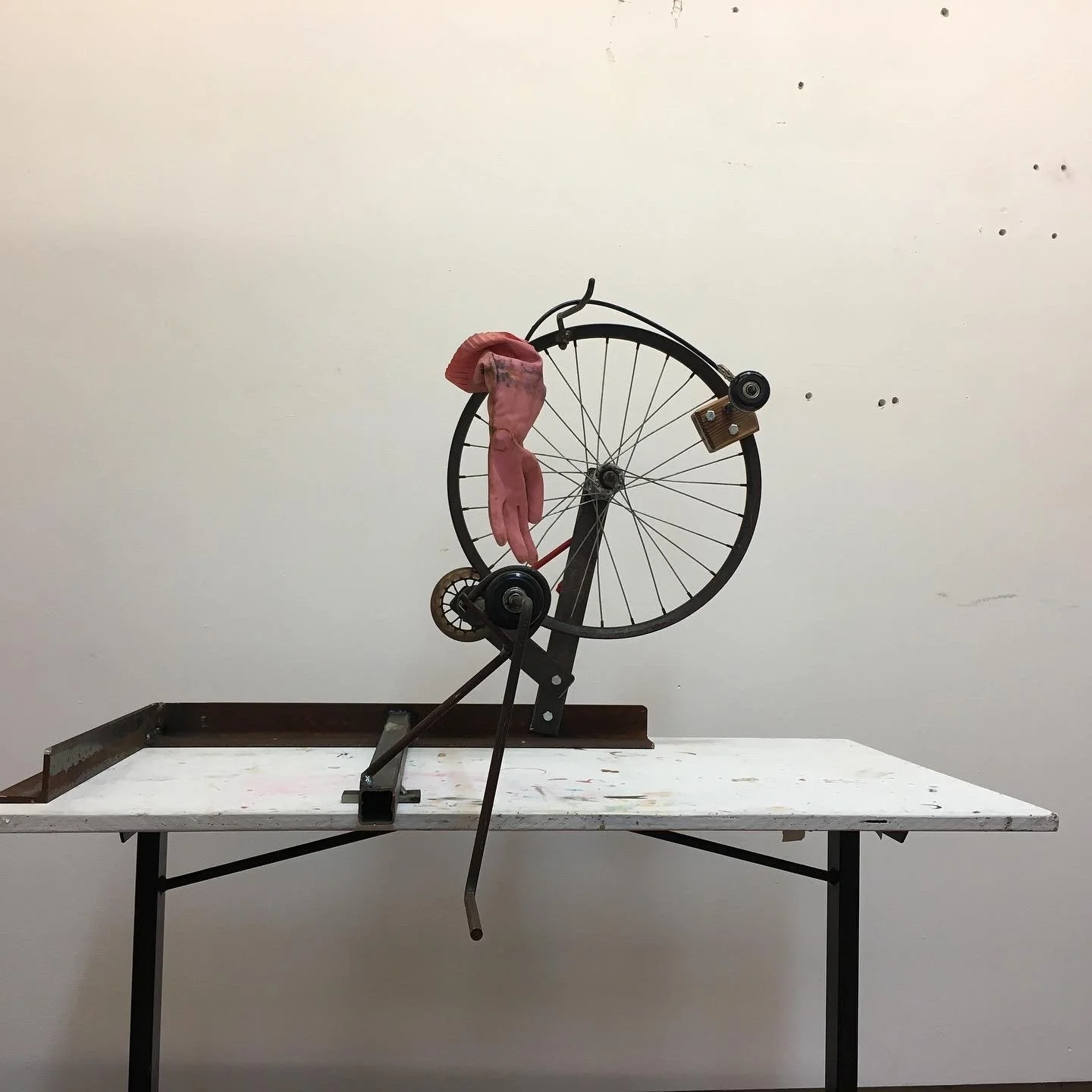 Thwap, 2022, Steel, Bike wheel, scooter wheel, skateboard wheel, timber and glove. 95 x 57 x 84 cm. NFS