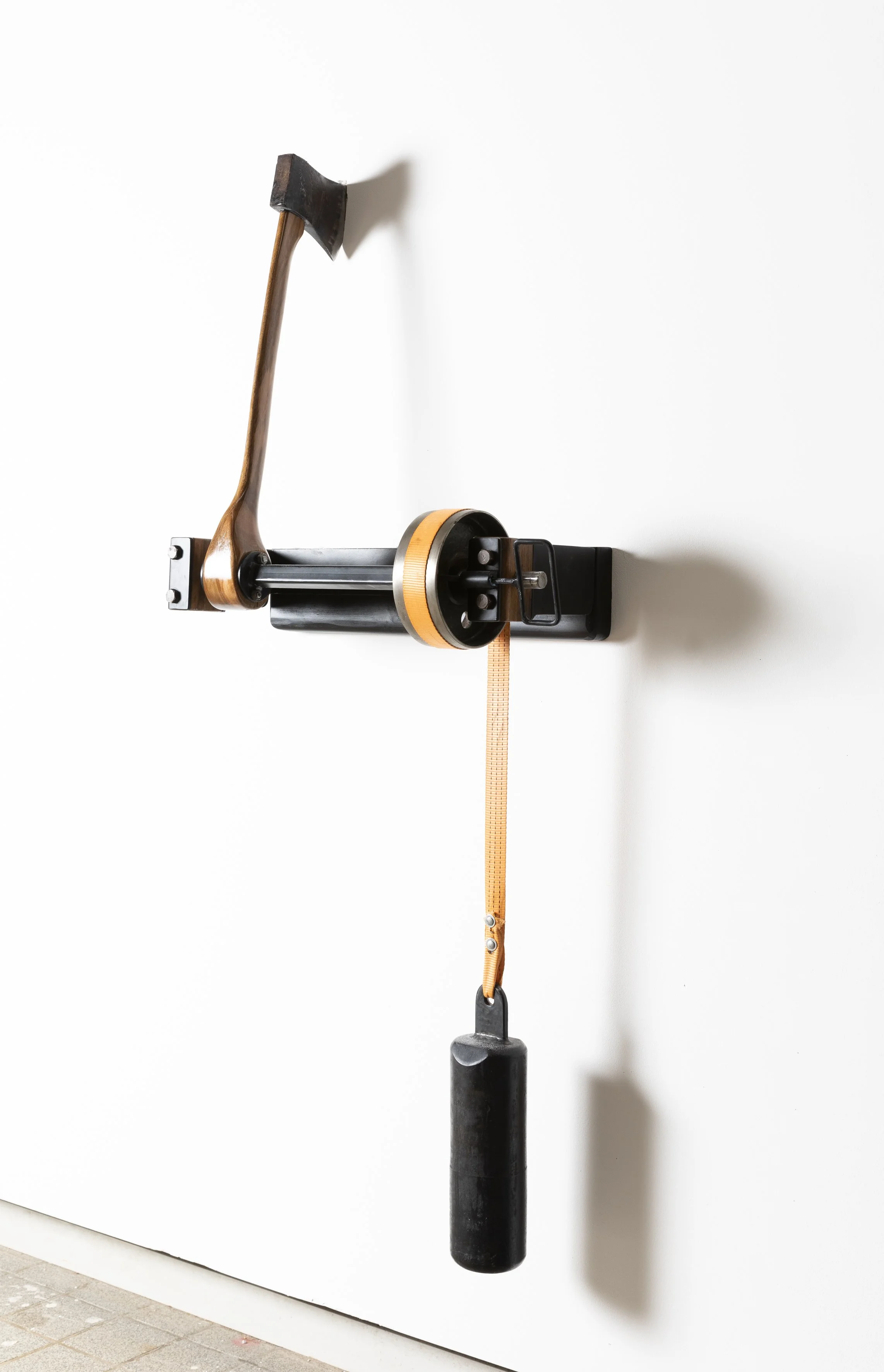 Premeditated, 2022, Steel, hardwood, tie-down strap, axe head, and cast iron wheel (Dimensions variable). P.O.R.