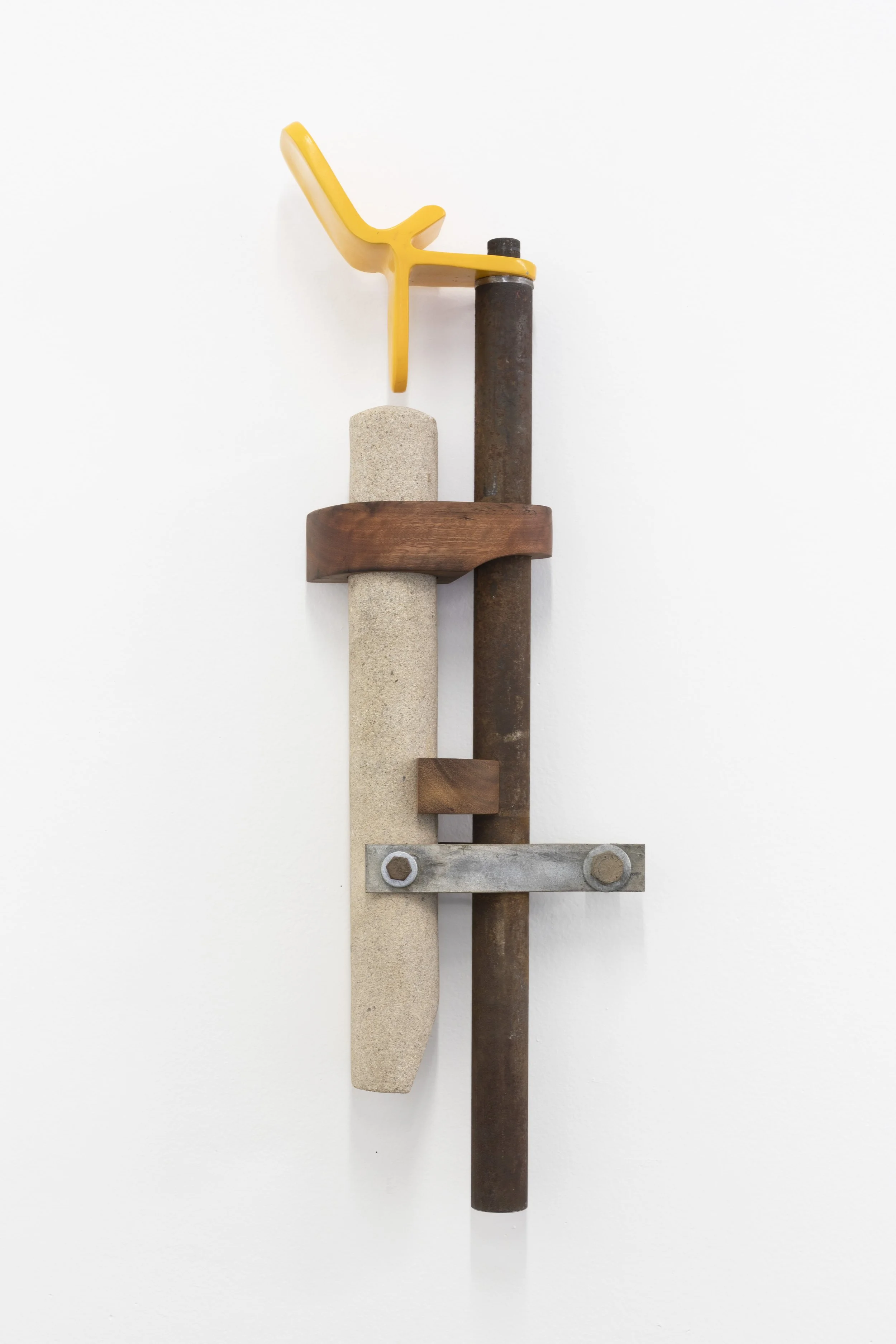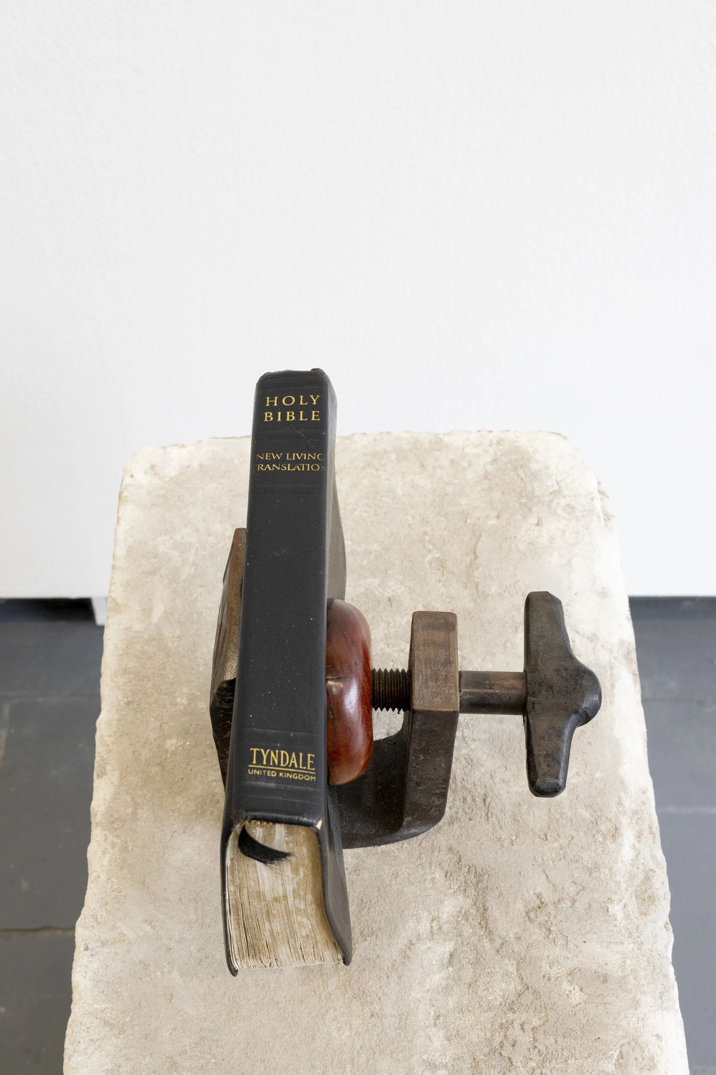 Bible Clamp, 2023. Bible, bolt, hand-forged clamp, hardwood, limestone. 95 x 40 x 55 cm. NFS